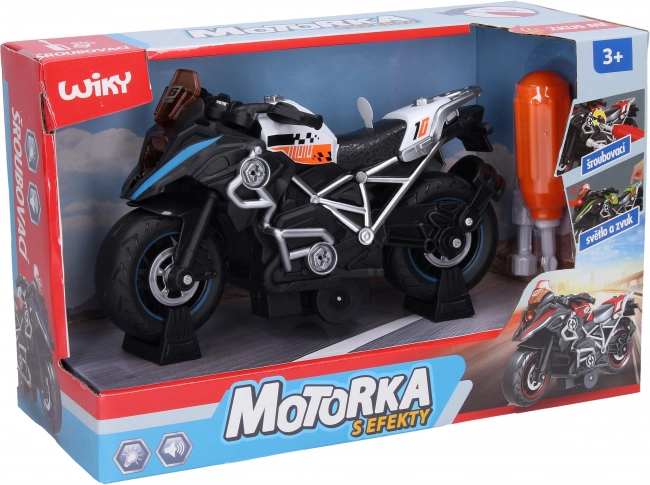Ten biały motocykl do skręcania o długości 20 cm to świetna zabawka rozwijająca motorykę małą i myślenie techniczne. Dzieci mogą samodzielnie rozebrać i ponownie złożyć pojazd za pomocą dołączonego śrubokręta i klucza. Po naciśnięciu tylnej części motocykla uruchamiają się efekty świetlne i dźwiękowe, które dodatkowo uatrakcyjniają zabawę.