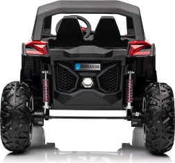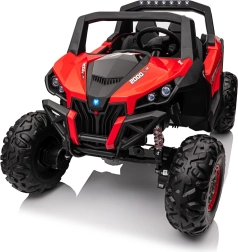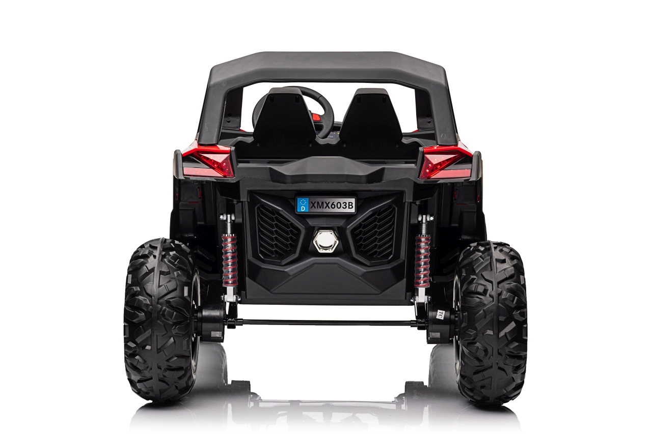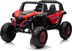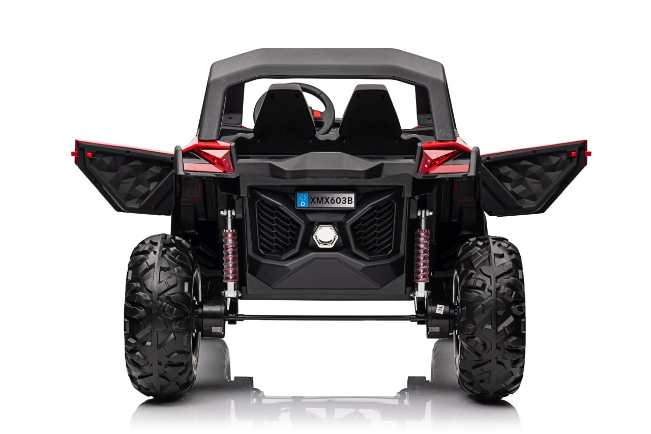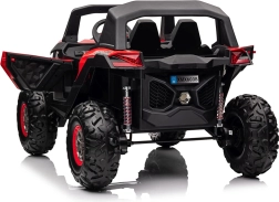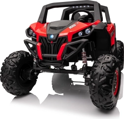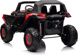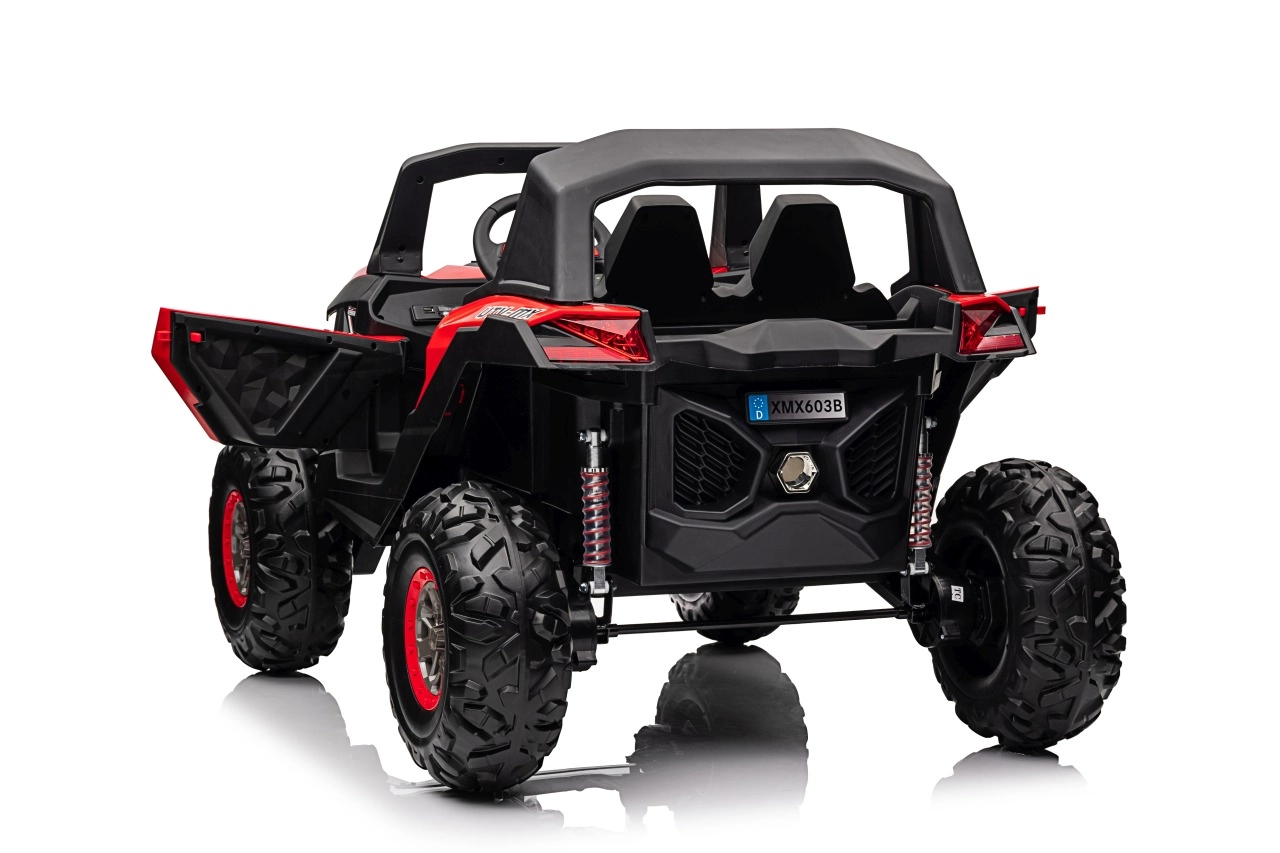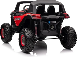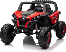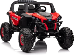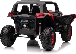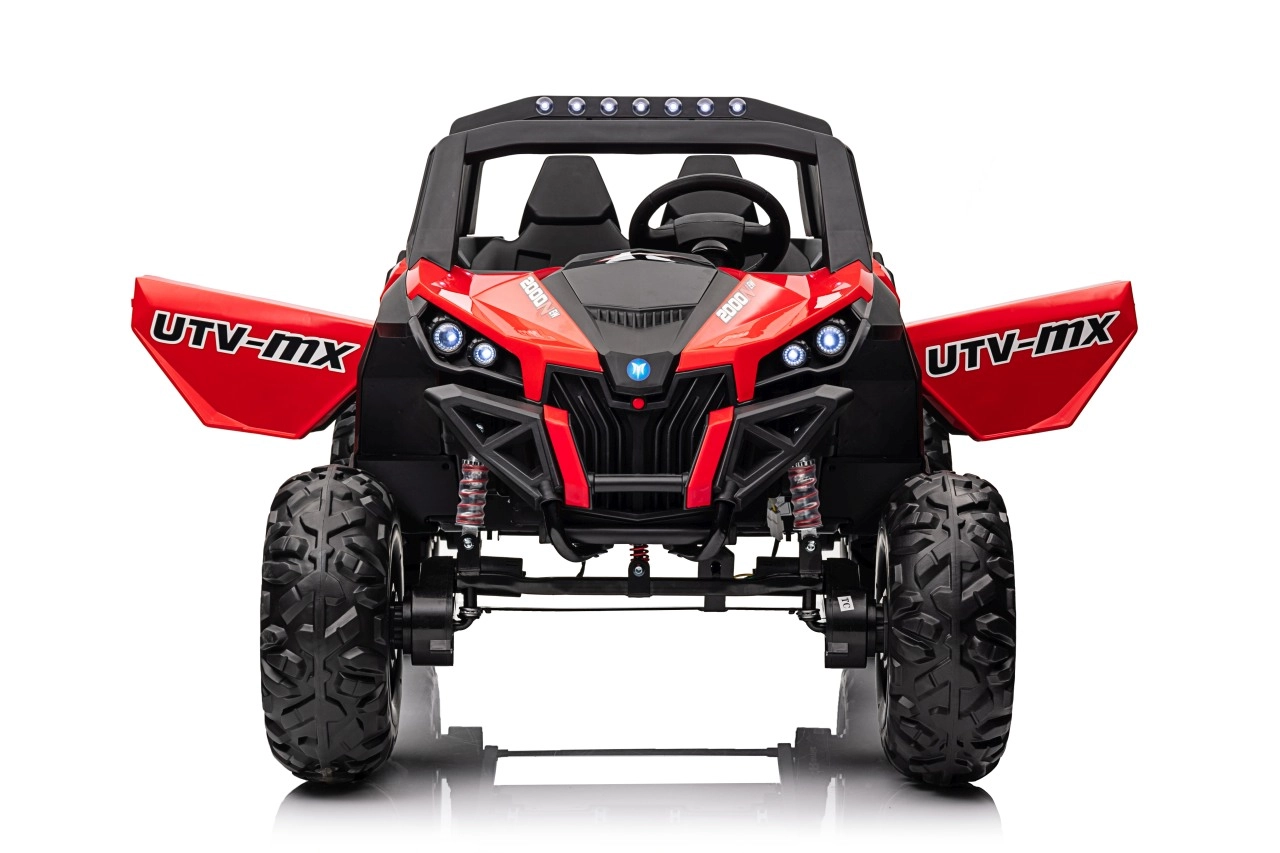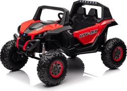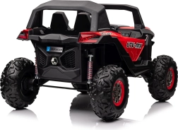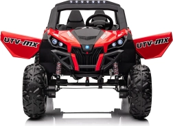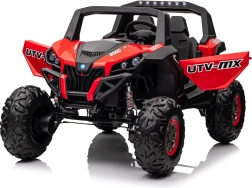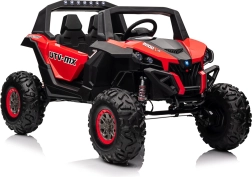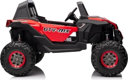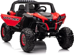 Dziecięcy jeździk Buggy UTV-MX Czerwony został zaprojektowany dla małych poszukiwaczy przygód kochających zabawę w terenie. Pojazd wyposażono w mocne silniki 4x75W oraz podwójny akumulator 12V/7Ah, które zapewniają wystarczającą siłę do różnych typów nawierzchni.