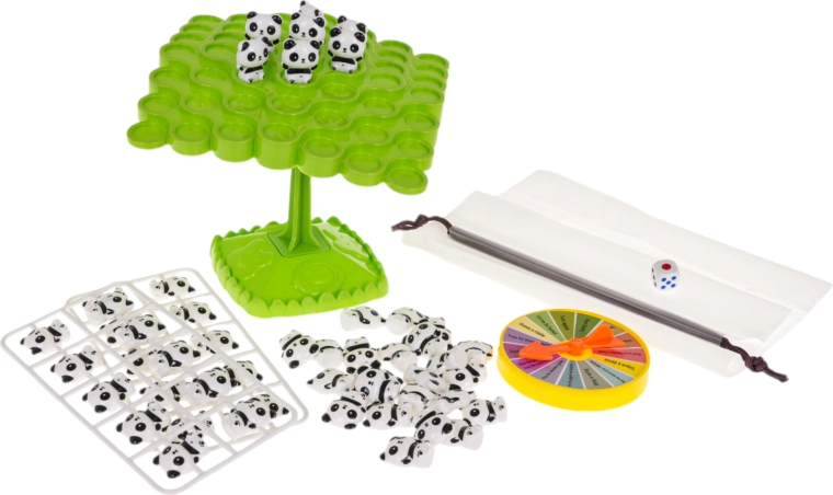 - podstawa, .- słupek, .- plansza, .- 50 figurek pand, .- kostka do gry, .- koło z zadaniami, .- woreczek z pandą. . |