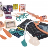 Zestaw zawiera różnorodne narzędzia medyczne takie jak stetoskop, termometr, lusterko dentystyczne i inne.