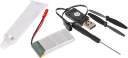 W opakowaniu znajduje się wszystko, czego potrzeba do montażu, w tym zapasowe śmigła, ładowarka USB i akumulator, co zapewnia, że samolot będzie gotowy do lotu w kilka chwil.