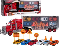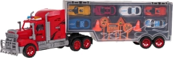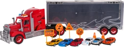 Duży zestaw dla małych kierowców: czerwona ciężarówka z odłączaną naczepą, która służy jako praktyczna walizka na 6 autek. W zestawie znajdują się także znaki drogowe i pachołki dla realistycznej zabawy. Zabawka wykonana z wytrzymałych materiałów, ma żywe kolory i jest odpowiednia dla dzieci od 3 lat.