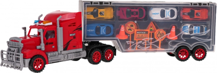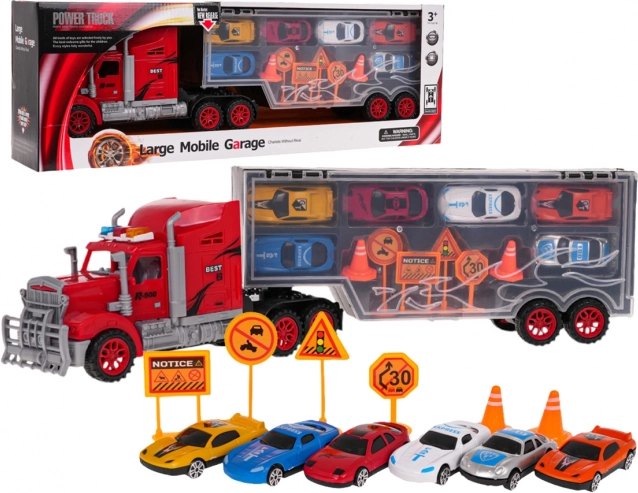 - Ciężarówka z naczepą, 6 autek, 4 znaki drogowe, 2 pachołki