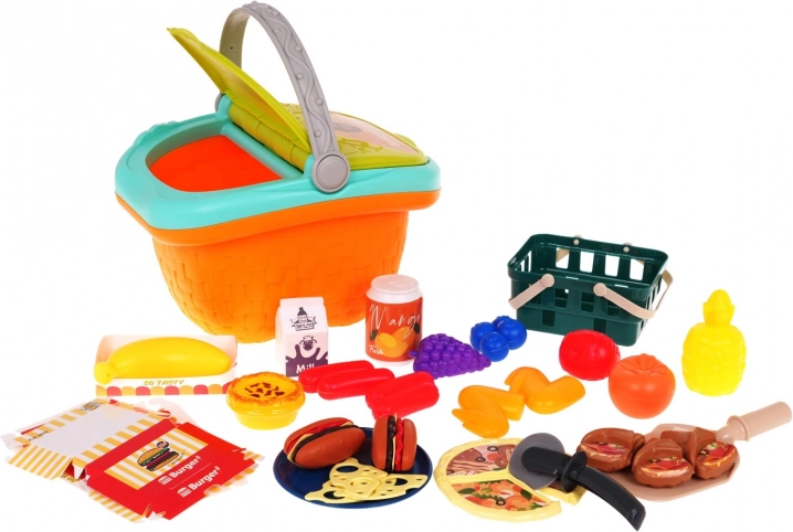 - duży kosz piknikowy z uchwytem, mały koszyczek, plastikowe owoce (ananas, truskawka, winogrona, banan, jagoda), pomidor, 2× parówka, 2× pałka z kurczaka, pizza, 3× tortilla, 2× hot dog, babeczka, 2× plaster sera, puszka napoju, kartonik mleka, talerzyk, łopatka do pizzy, nożyk do krojenia pizzy, 3× papierowa tacka, 2× pudełko na burgera, dekoracyjne naklejki