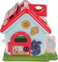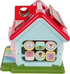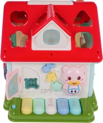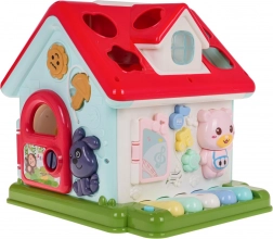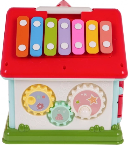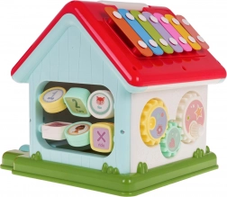 Dach domku skrywa ksylofon do pierwszego muzykowania oraz sorter kształtów z 6 kolorowymi klockami. Dzieci ćwiczą małą motorykę, koordynację ręka–oko i myślenie logiczne. Solidne wykonanie z wysokiej jakości plastiku w żywych kolorach przyciąga wzrok, a dzięki składanemu uchwytowi domek łatwo przenieść.