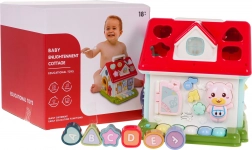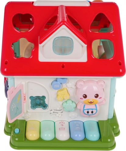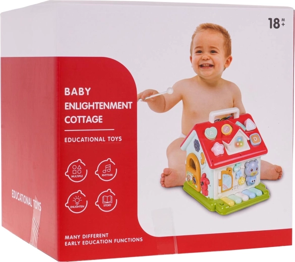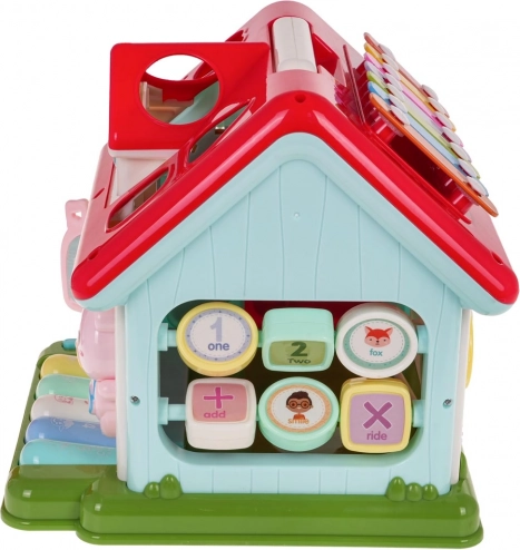 Odkryj zabawny sposób wprowadzania dzieci w świat muzyki, kształtów i kolorów. Interaktywny domek łączy pianinko z 5 klawiszami (liczby, zwierzęta i ich dźwięki, melodie, dźwięki Do–So), świecące okienko oraz mówiące/grające elementy ze zwierzątkami. Każda ścianka oferuje inną aktywność – od drzwiczek na kluczyk po koła zębate i obrotowe kostki z literami.