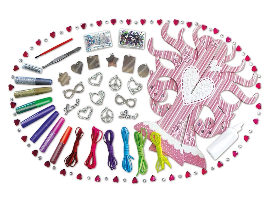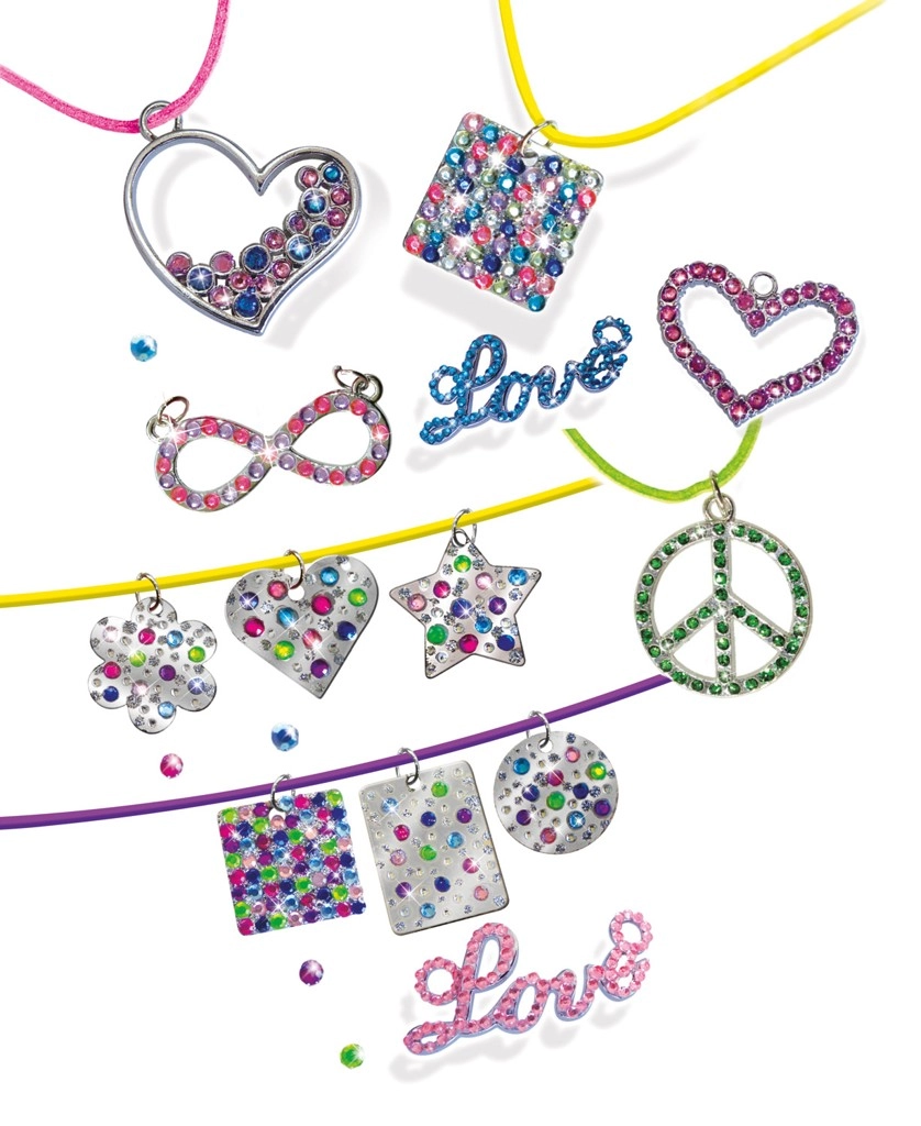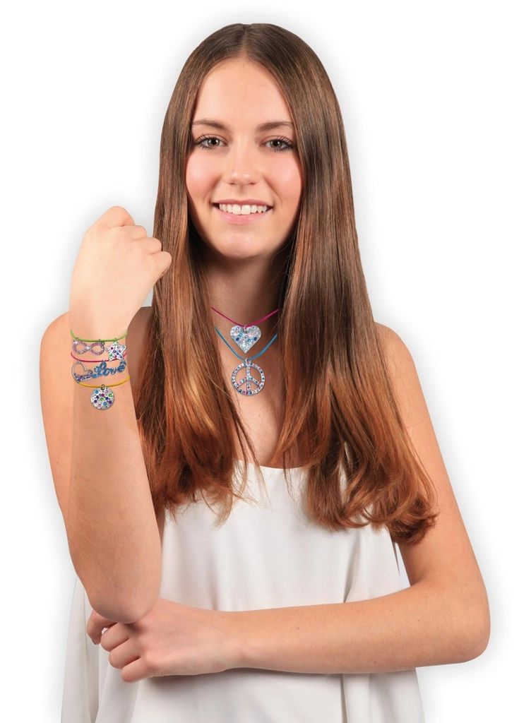 Dzieci mogą postępować według dołączonych instrukcji lub tworzyć całkowicie oryginalne projekty według własnej wyobraźni. Dzięki łatwej aplikacji kryształków i brokatu tworzenie jest zabawne i przystępne. Efektem są unikatowe bransoletki i naszyjniki z serduszkami, gwiazdami czy symbolami pokoju, które zachwycają kolorami.