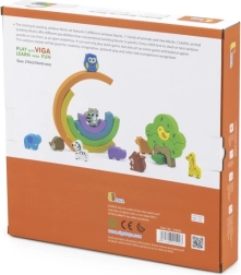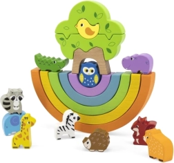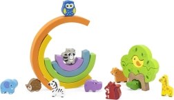 Kolorowa drewniana tęcza z 11 zwierzątkami i drzewkiem od Viga oferuje nieskończone możliwości twórczej zabawy. Dzieci trenują równowagę i koordynację, budują domki i przeszkody, uczą się kolorów i kolejności. Gładkie elementy z wysokiej jakości drewna są bezpieczne, bez ostrych krawędzi i malowane nietoksycznymi farbami.