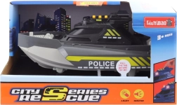 Zabawna policyjna łódź dla dzieci od 3 lat na baterie AG13. Po włożeniu baterii świeci i wydaje efekty dźwiękowe. Wysokiej jakości plastikowe wykonanie, baterie są częścią zestawu.