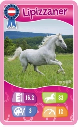 Zasady są proste: gracze dzielą między siebie cały zestaw kart, rozpoczynający gracz wybiera kategorię na swojej wierzchniej karcie, a wszyscy porównują wartości. Ten z najwyższą wartością zabiera karty i odkłada je na spód swojej talii. Gra jest szybka, przejrzysta i edukacyjna – świetny wybór dla miłośników koni i początkujących graczy.