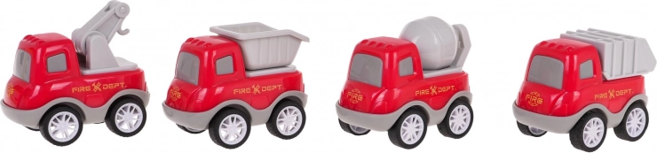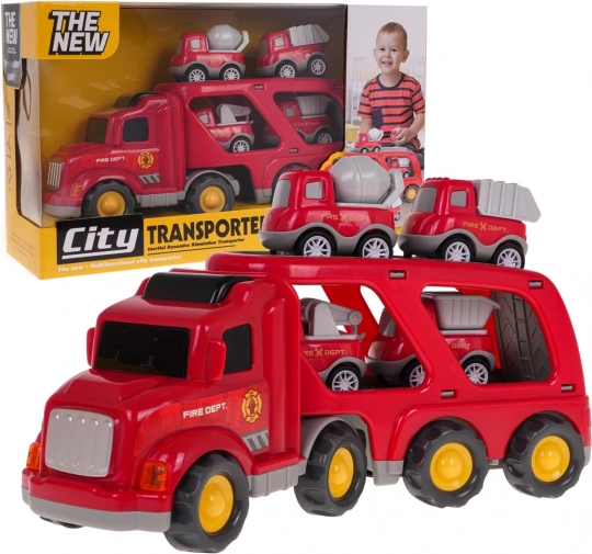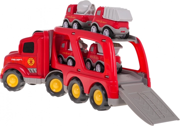 Ten szczegółowo wykonany zestaw pojazdów strażackich zapewni dzieciom długie godziny kreatywnej zabawy. Duża ciężarówka transportowa z odłączaną naczepą przewiezie aż cztery mniejsze pojazdy robocze. Po naciśnięciu przycisku na dachu kabiny zapalają się przednie światła i rozbrzmiewają autentyczne dźwięki uruchamiania, jazdy i klaksonu.