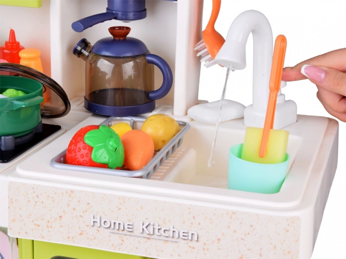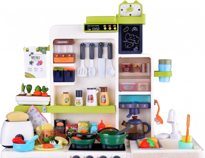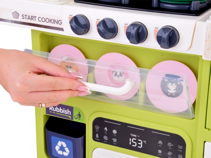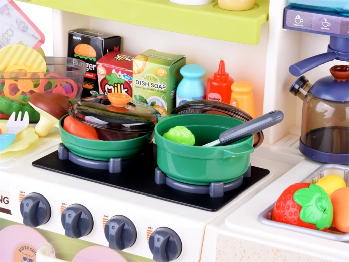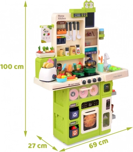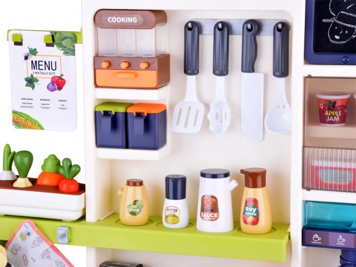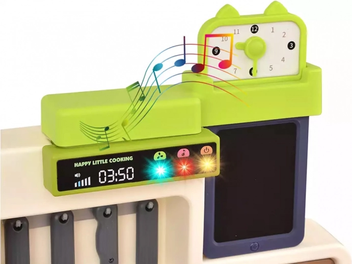 Wielofunkcyjna kuchnia w uspokajających kolorach zapewnia dzieciom autentyczne wrażenia z gotowania: dwa podświetlane palniki z dźwiękami, bezpieczny efekt pary, działający kran z obiegiem wody oraz otwierany piekarnik, lodówka i szafki do przejrzystego przechowywania wyposażenia. Dzięki panelowi muzycznemu z efektami świetlnymi, tablicy na notatki i zegarowi z ruchomymi wskazówkami zabawa staje się jeszcze bardziej urozmaicona.