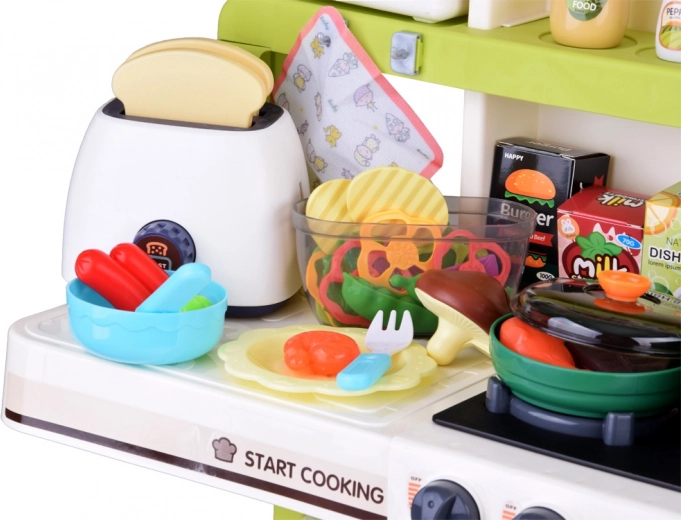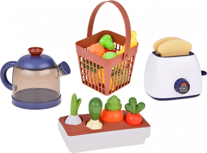 Talerze, garnki, patelnia z pokrywką, dzbanek, sztućce, przybory kuchenne, koszyk na warzywa, produkty spożywcze, sosy, przyprawy oraz toster z tostami – wszystko pod ręką do kreatywnej zabawy w odgrywanie ról.