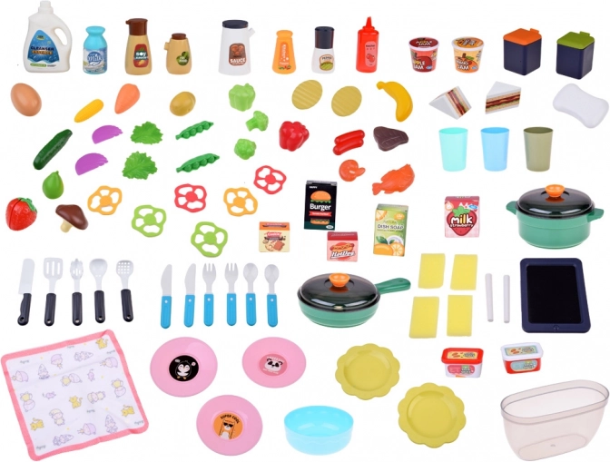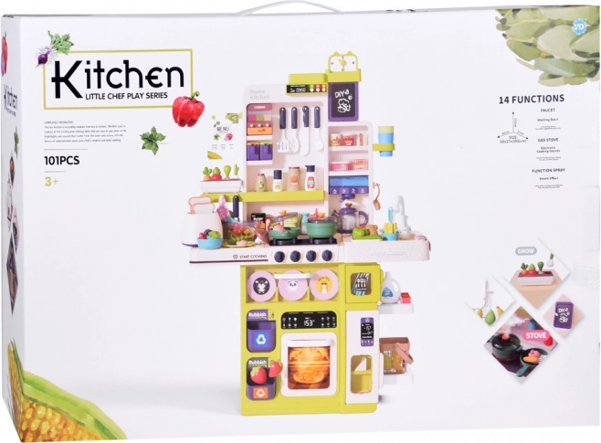 Bogaty zestaw 101 elementów obejmuje naczynia, sztućce, przybory kuchenne, produkty spożywcze oraz małą dziecięcą „elektronikę” (np. toster z tostami). Dzieci mogą próbować gotowania, serwowania i zmywania naczyń, jednocześnie ucząc się organizacji pracy, współpracy i zdrowych nawyków.