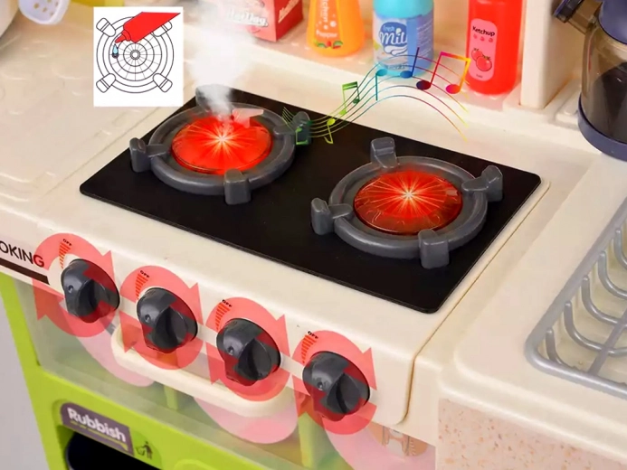 Dwa podświetlane palniki po przekręceniu pokrętła rozświetlają się na czerwono, uruchamiają realistyczne dźwięki, a po dodaniu wody tworzą bezpieczny efekt pary – zupełnie jak w prawdziwej kuchni.