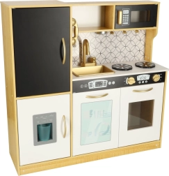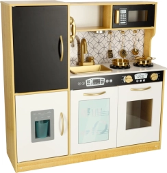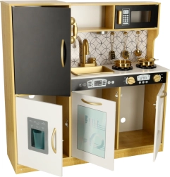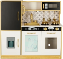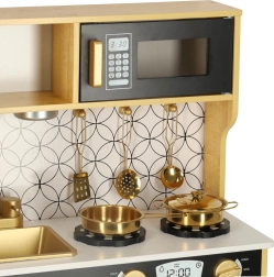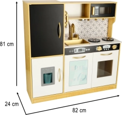 Drewniana kuchnia marki LULILO to doskonałe narzędzie edukacyjne, które wspiera rozwój dziecięcej wyobraźni i umiejętności manualnych. Kuchnia jest wyposażona w wiele funkcjonalnych urządzeń, takich jak lodówka z kostkarką do lodu, piekarnik, zmywarka i mikrofalówka, co czyni ją ulubionym miejscem na zabawy dla dzieci i organizowanie przyjęć dla lalek. Dzięki efektywnemu podświetleniu tworzy autentyczną atmosferę.