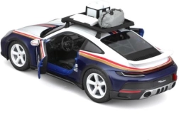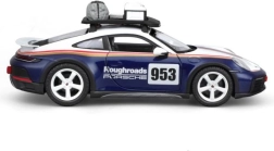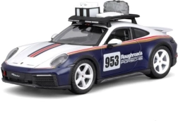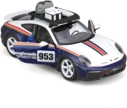 Spraw sobie lub dzieciom radość realistycznym modelem Porsche 911 Dakar w skali 1:24. Ten model die-cast w kolorystyce niebieskiej z białymi i czerwonymi pasami zachwyca precyzyjnymi proporcjami, emblematami Roughroads i ikonicznym numerem 953. Metalowa konstrukcja w połączeniu z plastikowymi detalami zapewnia trwałość i wierność oryginałowi.