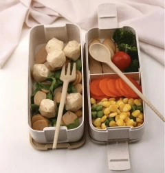 W skład zestawu wchodzi również zestaw sztućców ze słomy pszennej. Te praktyczne narzędzia obejmują łyżkę i widelec z falistym brzegiem do używania jako nóż. Sztućce łatwo umieszczają się w lunchboxie, zapewniając, że zawsze masz je pod ręką.