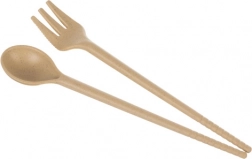 W zestawie znajduje się ekologiczny zestaw sztućców, który zawiera łyżkę i widelec z falistym brzegiem.