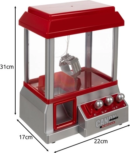 REALISTYCZNA MASZYNA CHWYTAJĄCA- Gra zręcznościowa „Candy Catching” tozabawka inspirowana kultowymi automatamido łapania nagród, które często spotykasz na nadmorskich promenadach i w parkach rozrywki. Została zaprojektowanadla dzieci powyżej 3 lat i stanowi doskonałą atrakcję, która angażuje maluchy w ekscytującą zabawę. Główną częściązabawki jestduży przezroczysty pojemnik wykonany z wysokiej jakości ABS, do któregosłodycze wrzuca się przez okrągły otwór umieszczony z tyłu.Po lewej stronieznajduje się kolejnyotwór z klapką, który zapobiega przypadkowemu wypadaniu cukierków.Dachowa konstrukcja skrywa mechanizm z pazurem, którym dzieci mogą sterować joystickami i poruszać nim w czterech kierunkach.