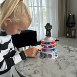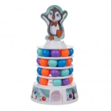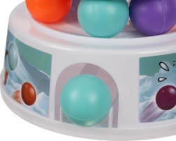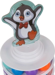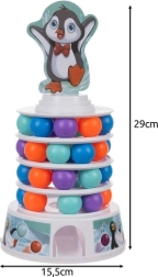 Zbuduj stabilną wieżę, umieść w każdym piętrze 9 kolorowych kulek, nałóż pierścień obwodowy, a na wierzchu ustaw kopułę z pingwinem. Gracze na zmianę kręcą ruletką i zgodnie z wylosowanym kolorem za pomocą patyczków wyciągają kulki tak, aby wieża się nie przewróciła. Kulki spadają do środka i wyjeżdżają otworem w podstawie – napięcie rośnie z każdym ruchem!