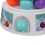 Co znajdziesz w opakowaniu: solidna podstawa z wyrzutem kulek i 2 naklejkami, 36 kulek w 4 kolorach (jasnoniebieski, niebieski, pomarańczowy, fioletowy), 3 pierścienie do budowy wieży, ruletka i 2 patyczki do wyciągania kulek.