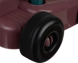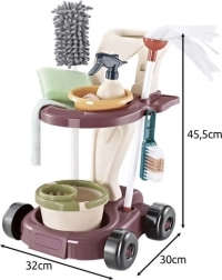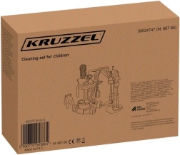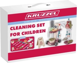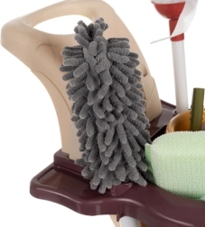 Wózek z ergonomicznym uchwytem - wózek na czterech szerokich kołach, wykonany z wysokiej jakości tworzywa PP, został zaprojektowany tak, aby łatwo się nim manewrowało. Ergonomiczny, szeroki uchwyt ułatwia dzieciom prowadzenie wózka nawet podczas zabawy w ruchu. Na dwóch półkach można umieścić różne elementy zestawu: wiaderko z sitkiem do mopa na dolnej półce oraz miseczkę, podstawkę, wyciskacz i mydelniczkę na górnej półce. Dzięki specjalnym otworom wózek pomieści okrągłą miotełkę do kurzu, gąbkę i mopa, co zapewnia łatwy dostęp do wszystkich narzędzi. Po bokach wózka znajdują się dwa haczyki do zawieszenia ściereczki z mikrofibry.