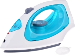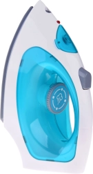 Żelazko jest wykonane z dbałością o szczegóły w białej i turkusowej kolorystyce, w tym z regulowanym pokrętłem temperatury.