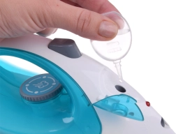 Żelazko posiada zamykany zbiornik na wodę, a do zabawki dołączona jest butelka do łatwego napełniania.