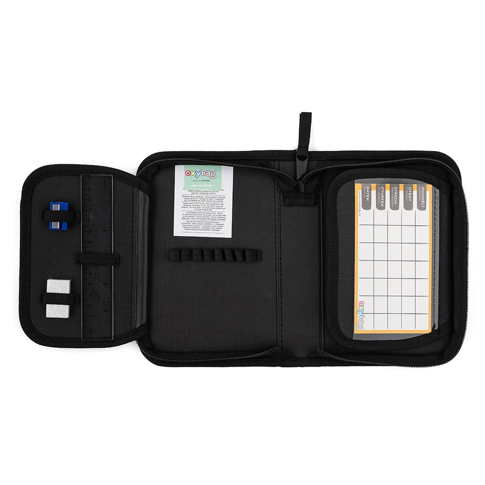 Na wewnętrznych skrzydełkach znajdziesz przezroczyste folie do łatwego włożenia planu lekcji lub notatek. Piórnik jest pusty, więc możesz wyposażyć go dokładnie według swoich potrzeb. Kompaktowe wymiary i niska waga świetnie sprawdzają się w tornistrze i plecaku.