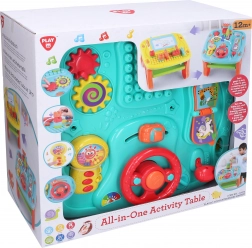 Dwustronny stolik aktywności 37 cm łączy zabawę i naukę w jednym. Górna strona z kierownicą, dźwignią zmiany biegów i grzechotkami rozwija małą motorykę i percepcję sensoryczną, natomiast spodnia z magnetyczną tablicą do rysowania i podkładką pod klocki wspiera kreatywność i wyobraźnię.