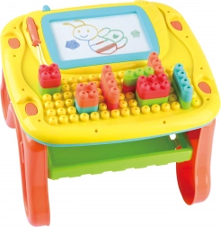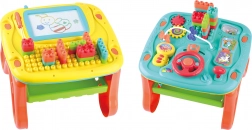 Zabawny dwustronny stolik dla dzieci oferuje dwie strefy zabawy w jednym: na górnej stronie znajdziesz kierownicę, dźwignię zmiany biegów i grzechotki, a na spodniej magnetyczną tablicę do rysowania oraz podkładkę do budowania z klocków. W zestawie są klocki, melodie oraz baterie, więc jest gotowy do użycia od razu. Kompaktowy rozmiar 37 cm pasuje do każdego pokoju dziecięcego.