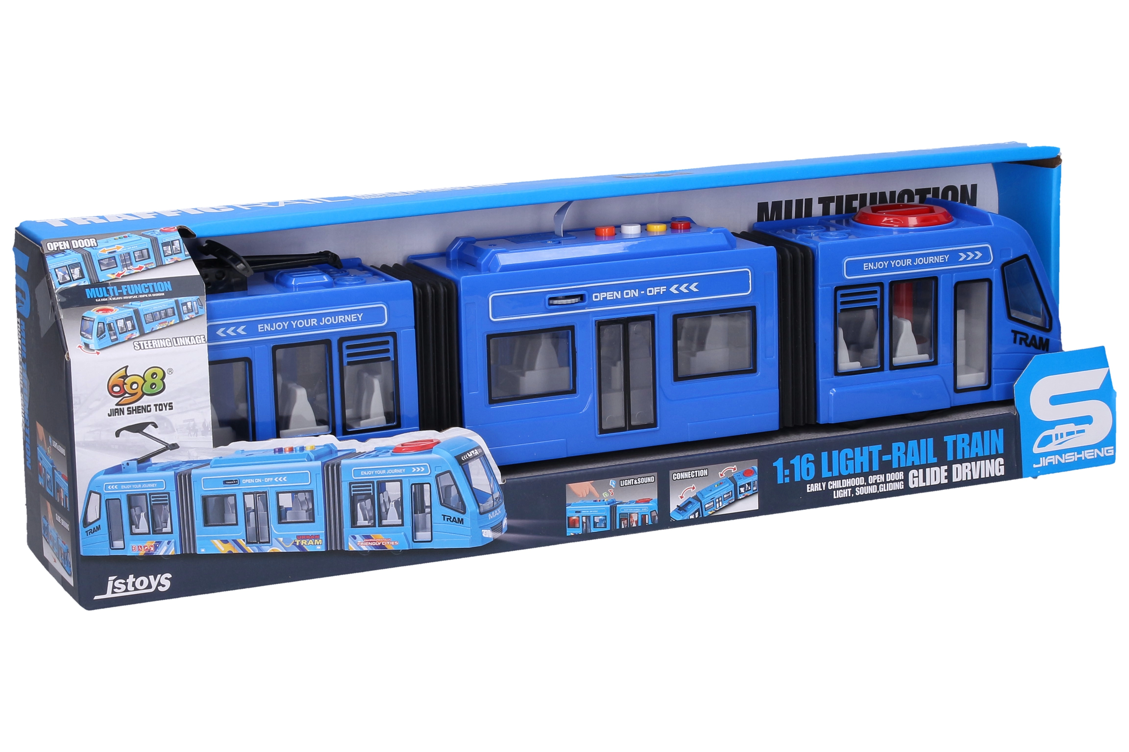 Realistyczny tramwaj dla małych i dużych miłośników komunikacji miejskiej. Oferuje efekty świetlne i dźwiękowe, napęd wolnobieżny oraz łatwe sterowanie za pomocą przycisków na dachu. Dzięki otwieranym środkowym drzwiom i skrętnym przednim kołom zabawa jest jeszcze ciekawsza. Baterie 3× AG13 znajdują się w zestawie, więc można od razu wyruszyć w trasę.