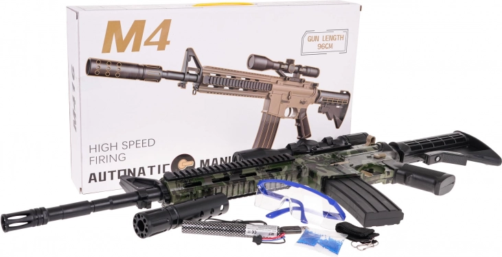 Odkryj dynamiczną zabawę z realistycznie wykonanym karabinem M4 na żelowe kulki dla nastolatków od 14 lat. Broń oferuje ręczny i automatyczny tryb strzału, optykę z powiększeniem oraz bogate akcesoria, w tym tłumik, magazynek i okulary ochronne. Żelowe kulki po trafieniu pękają i są bezpieczne, zasilanie zapewnia akumulator 7,4 V z ładowaniem USB.