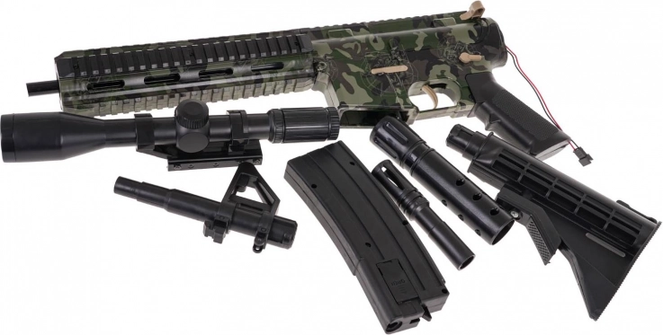- Realistyczny wygląd i modułowa konstrukcja – łatwy montaż lufy, tłumika, magazynka i kolby.