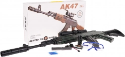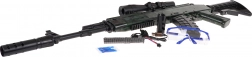 Jako amunicja służą kulki hydrożelowe (zalecana średnica ok. 7–8 mm), które przed użyciem wystarczy namoczyć w wodzie przez 4–6 godzin. Po namoczeniu odlej wodę i możesz grać. Kulki przy uderzeniu bezpiecznie pękają, dlatego nadają się do rekreacyjnego użytku. W opakowaniu znajdziesz bogaty zestaw akcesoriów: lufę, tłumik, magazynek, kolbę, celownik, a także akumulator 7,4 V z ładowaniem USB oraz gogle ochronne.