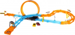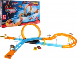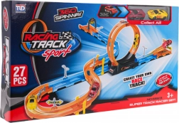 Duży tor wyścigowy z ostrymi zakrętami, pętlami i dwoma autkami w zestawie, idealny dla dzieci od 3 lat. Zawiera 27 elementów do samodzielnego montażu.
