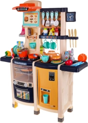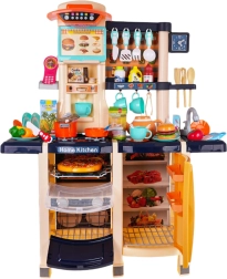 Ta interaktywna kuchenka wykonana jest z najwyższej jakości plastiku i zaprojektowana w żywych kolorach, które zachęcają dzieci do zabawy. Na blacie znajduje się interaktywna płyta grzewcza z palnikami. Po przekręceniu jednego pokrętła usłyszysz dźwięk gotowania, a drugiego – dźwięk smażenia, którym towarzyszy podświetlenie palników. Kran naprawdę wypuszcza wodę, co umożliwia dzieciom mycie zabawkowych naczyń. W skład zestawu wchodzi także atrapa lodówki z otwieranymi drzwiami i dystrybutorem wody, podświetlany piekarnik i zmywarka, ekspres do kawy, panel wentylacyjny ze światłami i dźwiękami oraz wiele innych dodatków.