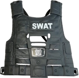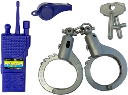Kamizelka taktyczna, krótkofalówka, kajdanki, gwizdek, odznaka i kabura pozwalają dzieciom wczuć się w akcję jak prawdziwi policjanci lub jednostka SWAT.