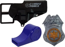 W zestawie znajduje się kabura, odznaka i gwizdek – wszystko, czego mały policjant potrzebuje do pilnowania porządku i odgrywania akcyjnych scenek.