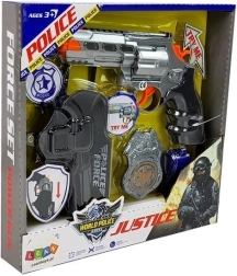 Kompletny policyjny zestaw dla małych stróżów prawa zawiera realistyczny plastikowy rewolwer 20 cm z efektami świetlnymi i dźwiękowymi, kaburę, odznakę oraz gwizdek. Wytrzymałe wykonanie z wysokiej jakości plastiku, zasilanie w zestawie, zabawka odpowiednia dla dzieci od 3 lat.