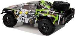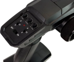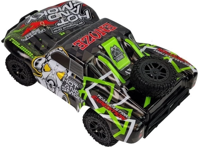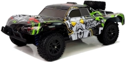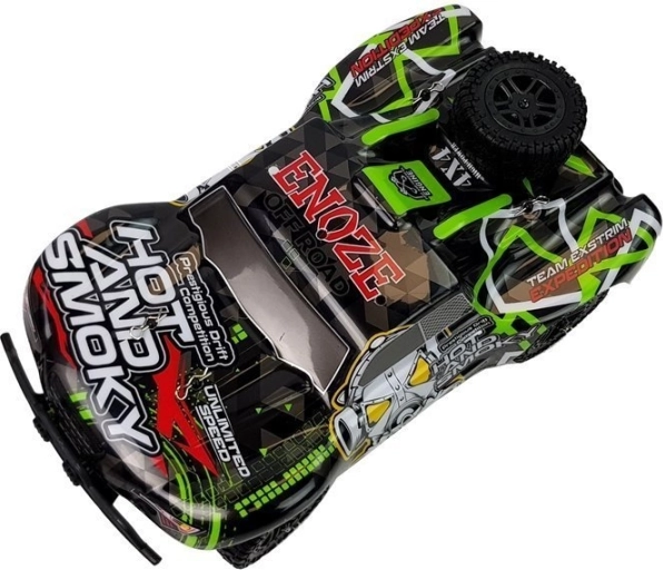 Zestaw jest RTR – Ready To Run: w pudełku znajdziesz auto, pistoletowy kontroler 2,4 GHz, akumulator 7,4 V 850 mAh oraz ładowarkę. Zasięg sterowania to około 50 metrów, czas jazdy około 15 minut, a ładowanie trwa około 3 godziny. Solidne materiały (części metalowe i plastikowe, elektronika, guma) zwiększają odporność na uderzenia.