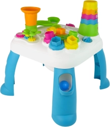 Interaktywny edukacyjny stolik w biało‑niebieskiej kolorystyce został zaprojektowany tak, by dzieci rozwijały umiejętności poprzez zabawę. Dzięki efektom świetlnym przy wkładaniu kształtów, barwnym elementom i zjeżdżalni na kuleczki maluchy trenują koordynację ręka–oko, logiczne myślenie i wyobraźnię. Odpinane nogi umożliwiają zabawę na dywanie lub w łóżeczku, a panel można dzięki paskom przymocować do ramy łóżeczka.