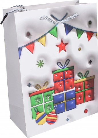 Stylowa świąteczna torebka prezentowa w uniwersalnym rozmiarze M (26 × 32 × 10 cm) do łatwego i eleganckiego pakowania prezentów. Cztery świąteczne warianty nadruków nadadzą Twoim podarunkom magiczny wygląd.