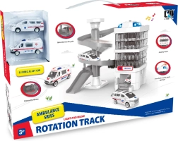Ten zestaw obejmuje wielopoziomowy obrotowy zjazd z metalowym samochodzikiem ambulansowym, który gwarantuje interaktywne wrażenia z zabawy.