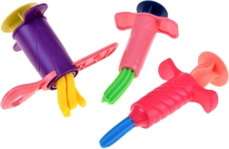 Tłoki i praski tworzą różne wzory oraz paseczki „ciasta”. Dzieci łatwo osiągną imponujące rezultaty i poćwiczą zręczność.