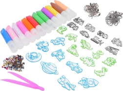 Ten rozszerzony zestaw wprowadza dzieci w świat twórczości poprzez zabawę. Specjalne farby łatwo nakłada się w wyprofilowane linie szablonów, nie rozlewają się poza krawędzie i pomagają uzyskać precyzyjne, efektowne breloki. Gotowe motywy wystarczy ozdobić dekoracyjnymi kamyczkami i zawiesić na metalowych łańcuszkach kulkowych – idealne do kluczy, plecaka lub jako dekoracja do pokoju.