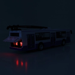 Obsługa jest prosta i wciągająca: drzwi otwierasz ręcznie, zamykasz je po naciśnięciu przycisku na dachu i obserwujesz, jak podczas zamykania migają przednie światła. Trolejbus jeździ na napędzie wstecznym, więc łatwo rusza po podłodze. Baterie LR44/AG13 są już w zestawie, więc możesz zaczynać zabawę od razu po rozpakowaniu.