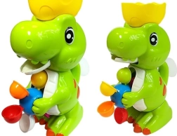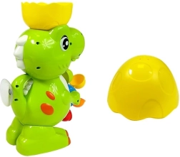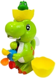 Zielony dinozaur ma też swojego malucha, z którym Twój brzdąc może bawić się w wodzie. Kolorowy młynek zapewni Twojemu dziecku frajdę przy każdej kąpieli. Wystarczy nabrać wodę, a następnie wlać ją do połówki skorupki na głowie dinozaura. Woda będzie wypływać z paszczy dinozaura, a potem spływać po kolorowych bębenkach, wprawiając je w ruch.