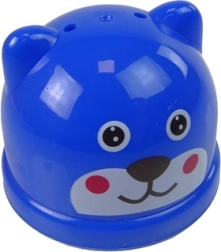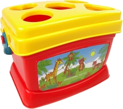 Wiaderko z pokrywką służy jako sorter kształtów z motywami zwierząt, co umożliwia interaktywną zabawę oraz rozpoznawanie kształtów i kolorów.